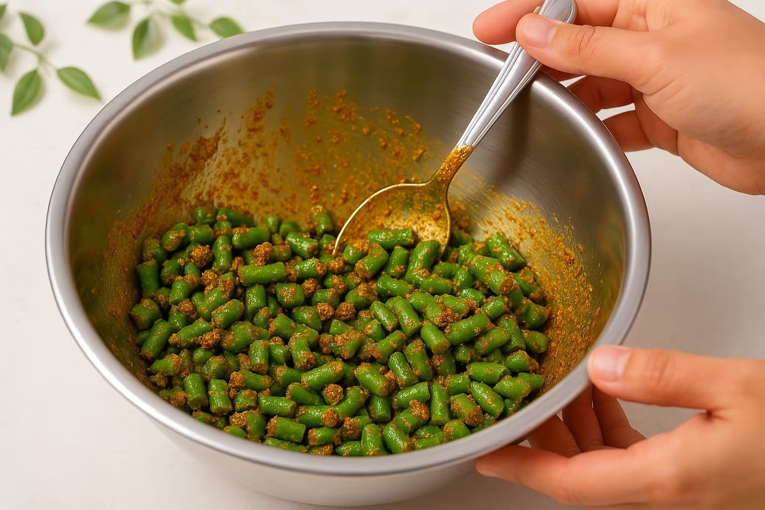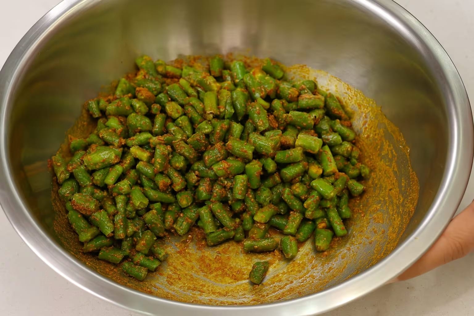 Now add chopped green chillies and mix it well. Add salt as per taste and mix well so that the spice and oil are well applied on every chili.