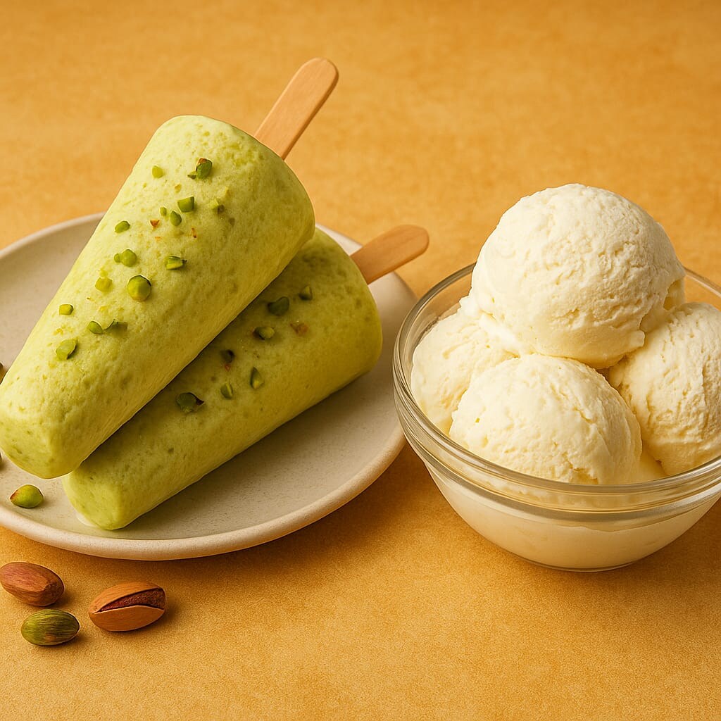 Kulfi is usually made at home with aromatic spices, pistachios, almonds and sometimes khoya or condensed milk like full fat milk, sugar, cardamom and saffron. It is cooked slowly and thickened and then freeze and settled. Because of this, the texture of Kulfi is dens and creamy.
