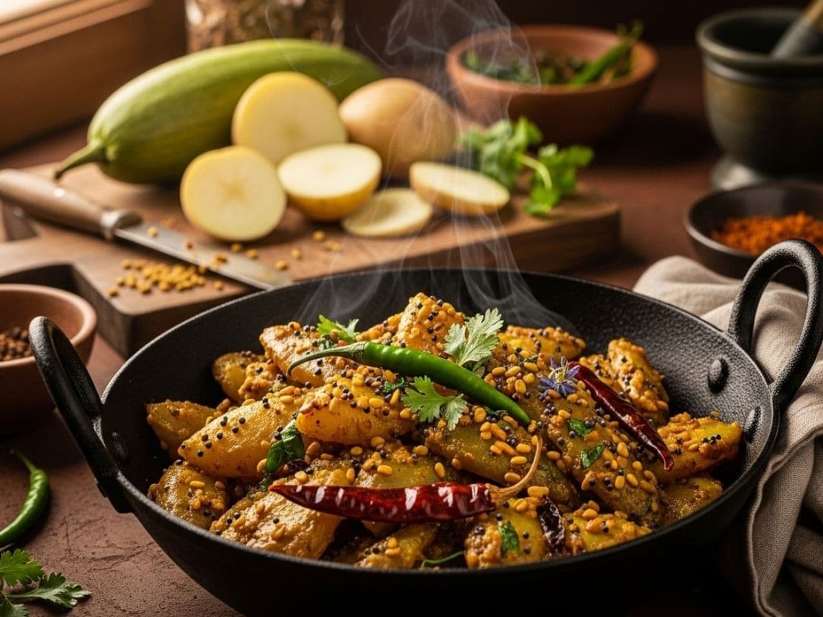 Easy way to make Achari Aloo Parwal vegetable. (AI)Achari Aloo Parwal Material